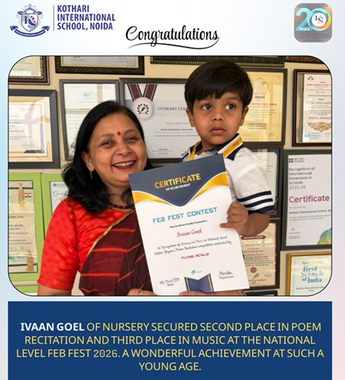Ivaan Goel of Nursery, Kothari International School, participated in the National Level “FEB FEST” 2026 organized by Flying Petals. Competing in Category A (Nursery, L.K.G, U.K.G), he demonstrated exceptional talent across multiple disciplines. He secured 3rd place in the National Level Online Music Competition