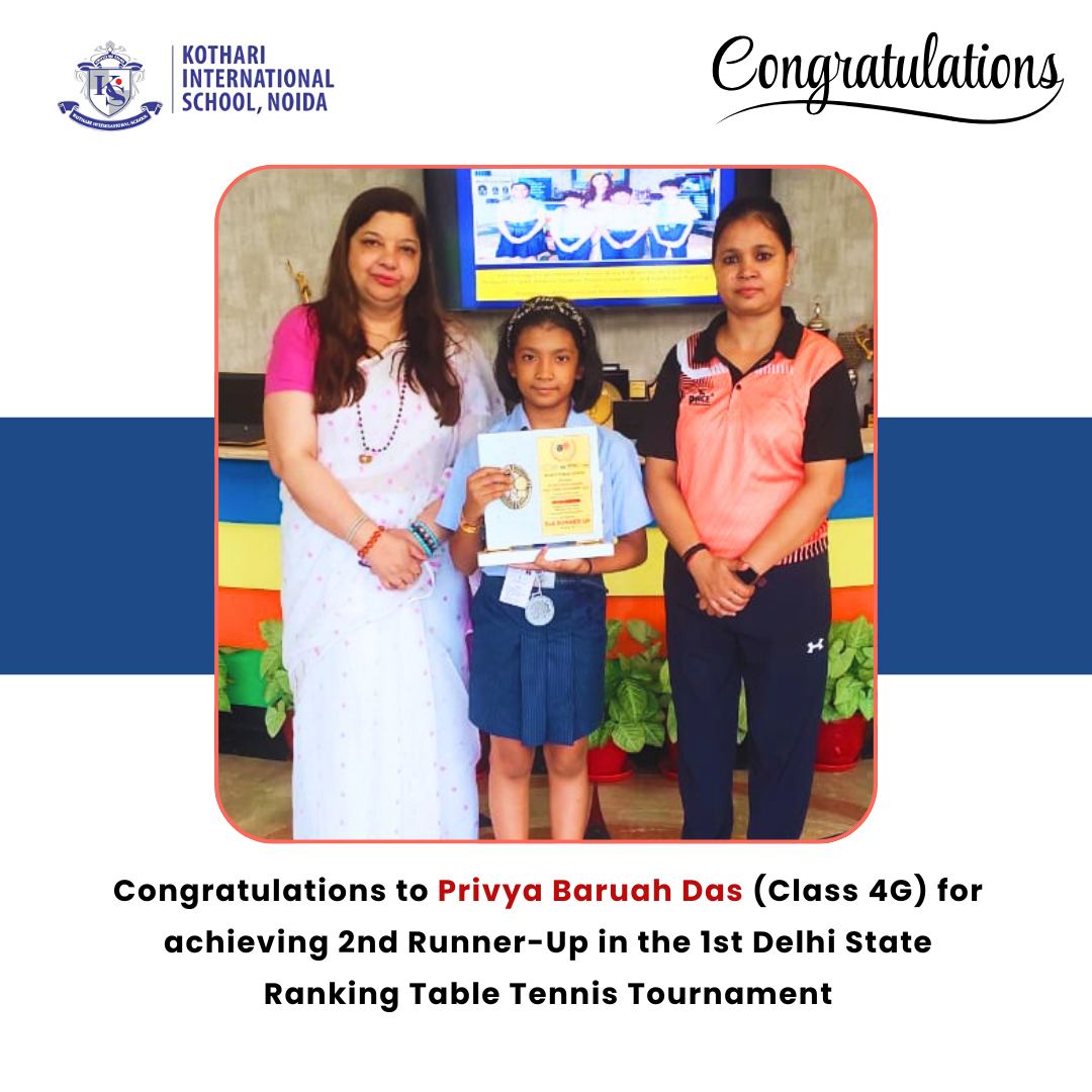 We are proud to share that Privya Baruah Das from Class 4G has achieved an impressive milestone by securing the second runner up position at the 1st Delhi State Ranking Table Tennis Tournament.