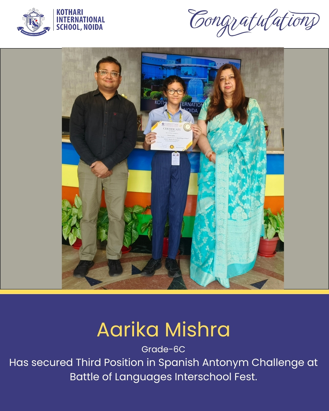 We are proud to share that Aarika Mishra of Grade 6C participated in the Interschool Language Fest – Battle of Languages hosted at Sarottam International School, Greater Noida West, on 30th July 2025. She showcased her linguistic skills in the Spanish Antonym Challenge and secured the 3rd Position. Congratulations to Aarika for this remarkable achievement and for making KIS shine on the interschool platform!