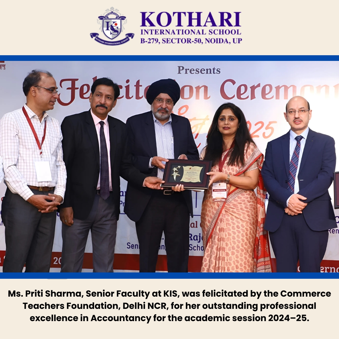 Kothari International School is delighted to share that our Senior Faculty, Ms. Priti Sharma, has been felicitated by the Commerce Teachers’ Foundation, Delhi-NCR Schools at a prestigious ceremony held at the India International Centre, Lodhi Gardens on Sunday, 14th September 2025.